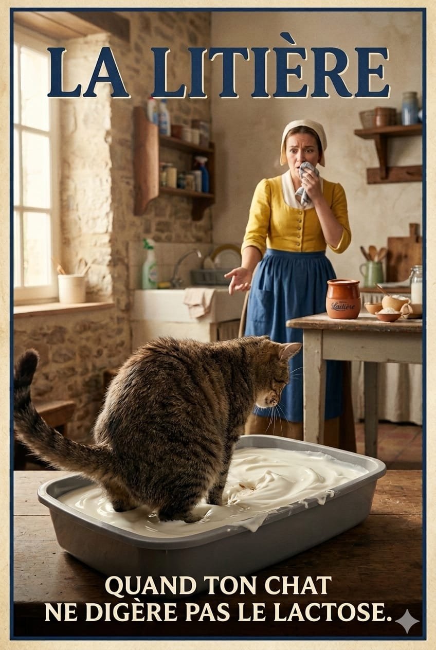 Voici donc La Litière : le seul produit laitier qui déclenche chez votre chat un réflexe ancestral. Creuser. Gratter. Et parfois… regretter ses choix alimentaires.